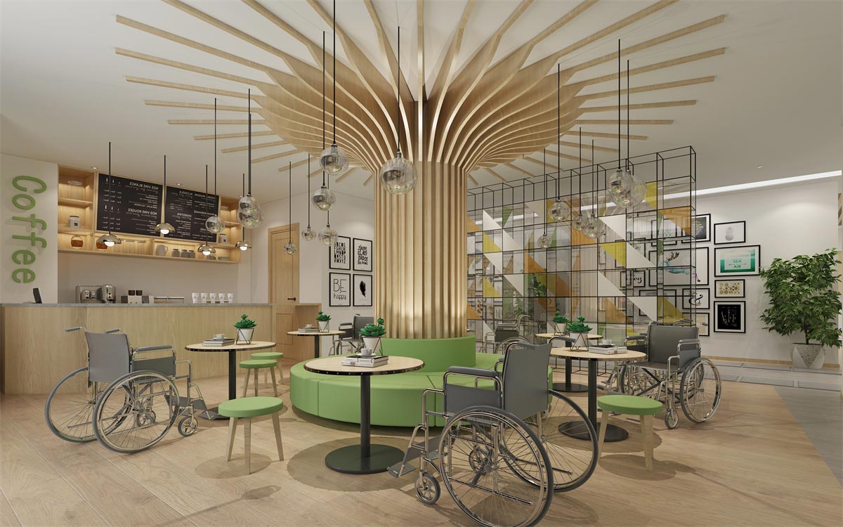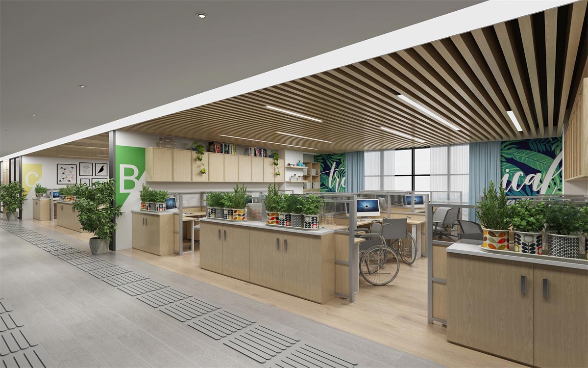 整個(gè)辦公室設(shè)計(jì)以關(guān)愛(ài)殘障人士為主題,采取綠色點(diǎn)綴,暖色為主的色彩搭配,表現(xiàn)辦公室溫馨而又充滿(mǎn)生機(jī)的辦公氛圍,從設(shè)計(jì)實(shí)景圖中可以看出,辦公環(huán)境表達(dá)對(duì)殘障人士的關(guān)懷和能力的認(rèn)可與肯定。